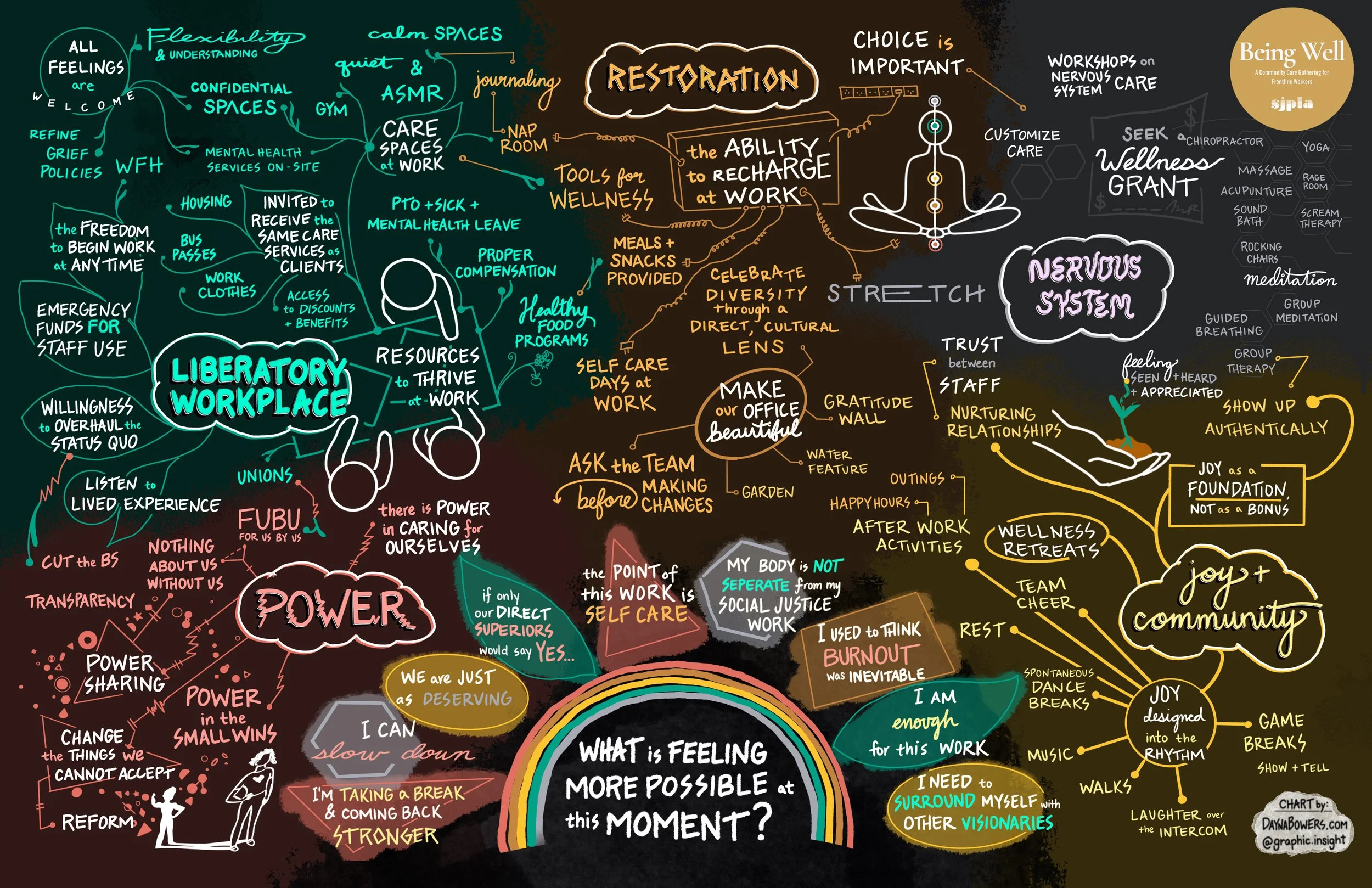 A key goal of Being Well was creating a space for workers to imagine workspaces that better support frontline staff. Participants shared ideas for what truly supportive organizations could look like: